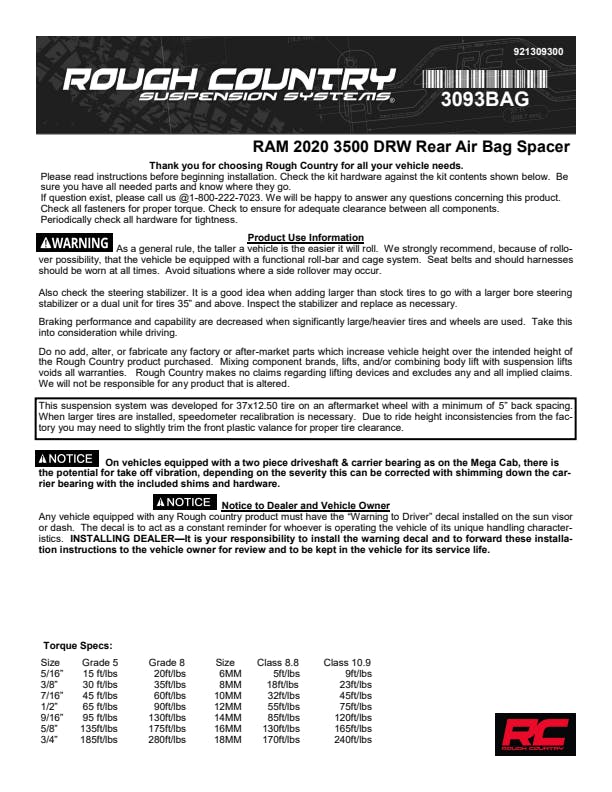 Unmatched Height: Compliment your RAM 3500's aggressive, good looks with Rough Country's new 5-inch Lift Kit with lifted coil springs. New model RAM Trucks come with a wealth of impressive features right from the factory. Rough Country's new 5-inch kit was engineered to retain these impressive factory specs while bumping up performance and durability where it's needed most. The result is a lifted beast with a mean profile and lush ride quality that'll make other Ram owners wonder where you got yours from! Durable Design: When changing a vehicle's suspension, the key to preserving ride quality is in keeping the geometry of all suspension components as close to their factory angles as possible. Rough Country's new 5-inch Suspension kit features a set of ultra-durable Radius Arms, precision fit to bolt right into the factory mounts for an easier install and a more factory-like angle. These beefy, upgraded Radius Arms also feature a durable, durable rubber bushings for maximum vibration absorption. This kit also includes a skid plate and a set of front, lifted coil springs for unparalleled ride quality from your lifted Ram 3500.Installation and Warranty: Our 5-inch Suspension Lift Kit provides an easy bolt-on installation with minor cutting and drilling required. Install time is just 6-8 hours, and all the hardware and instructions are included in the kit. Plus, our suspension lift kits are backed by Rough Country's Limited Lifetime Replacement Warranty, so you can rest assured that your investment is protected. So order your kit today and get your Ram 3500 looking its best!