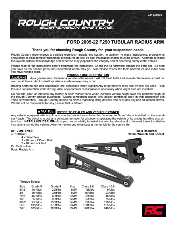 Elevate your Ford F-250/F-350 Super Duty with Rough Country's premium Tubular Radius Arms! Engineered to perfection, this upgrade kit is tailored for models with 3" or more of lift, ensuring a seamless fit and enhanced performance. Upgrade with Ease: Effortlessly install our Tubular Radius Arms on your Ford F-250/F-350 Super Duty with a 100% bolt-on design. Maximum Vibration Absorption and Longevity: Equipped with durable OE-Style Rubber Bushings, these tubular arms ensure maximum vibration absorption for a long lasting, smooth ride on any terrain. Precision Alignment: Maintain proper alignment without the need for additional drop brackets, enhancing handling and control without compromise. Stylish Design: With its sleek tubular-style design, our Radius Arm Kit adds a touch of aftermarket flair while boosting performance. Built to Last: Featuring a massive 2-inch outside diameter and gusseted design, these arms are built to withstand the toughest conditions, ensuring durability and reliability for years to come. Adjustable Alignment: Each Radius Arm includes lower cam slots to easily adjust caster for better handling on and off-road. Reform your Ford Super Duty today and conquer the road with confidence with our Tubular Radius Arm Kit!