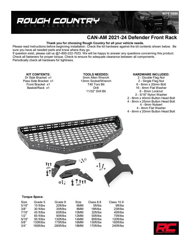 Easy Access. Overland adventures require bringing plenty of gear along for the ride. Ensure that your Can-Am Defender has plenty of cargo space by installing Rough Country's Front Cargo Rack Kit. This rock-solid rack design can provide storage to haul all of your gear without sacrificing your cab, or bed space! Durable Construction. Rough Country's cargo rack kit is constructed from heavy-duty steel and features a laser-cut mesh pattern that provides plenty of mounting points to secure your load. Installation. With minor drilling required for installation, an estimated timeframe of 3-4 hours is recommended to complete this full installation. This full kit can be installed at home and can be completed efficiently and quickly! Limited Lifetime Replacement Warranty. Rough Country's Front Cargo Rack is backed with a limited lifetime replacement warranty towards manufacturer defects. As such, the product is protected from structural and workmanship damage after the date of purchase. With our industry-leading warranty give yourself peace of mind when using Rough Country's Suspension products!